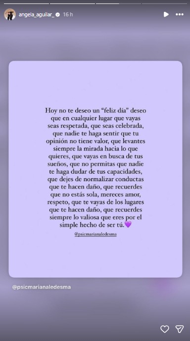 Entre las historias publicadas por Ángela Aguilar también destacó un mensaje dedicado a visibilizar las experiencias que viven muchas mujeres. El texto plantea un deseo diferente al tradicional “feliz día”, enfocándose en el respeto, la autoestima y la libertad de perseguir sueños sin permitir que nadie cuestione el valor personal.