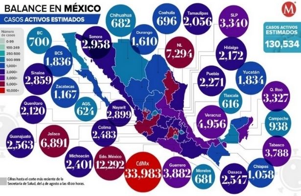 Por su parte, Tlaxcala es el estado con menos casos activos estimados de coronavirus, con 616; le sigue Aguascalientes con 624 casos.